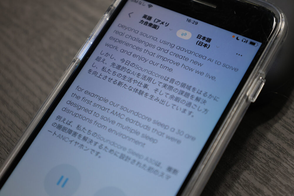 翻訳された内容はスマートフォンの画面上にテキストで表示されるほか、イヤフォンを通じて音声でも再生される。実際に英語音声が日本語に翻訳されるのを体験したところ、かなり実用的な翻訳精度だった。