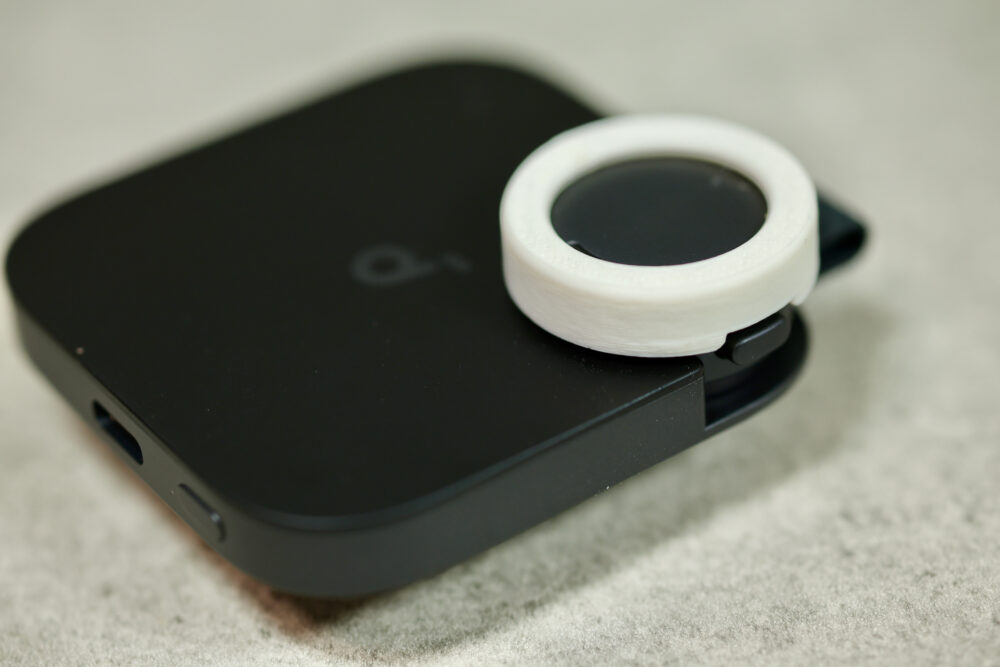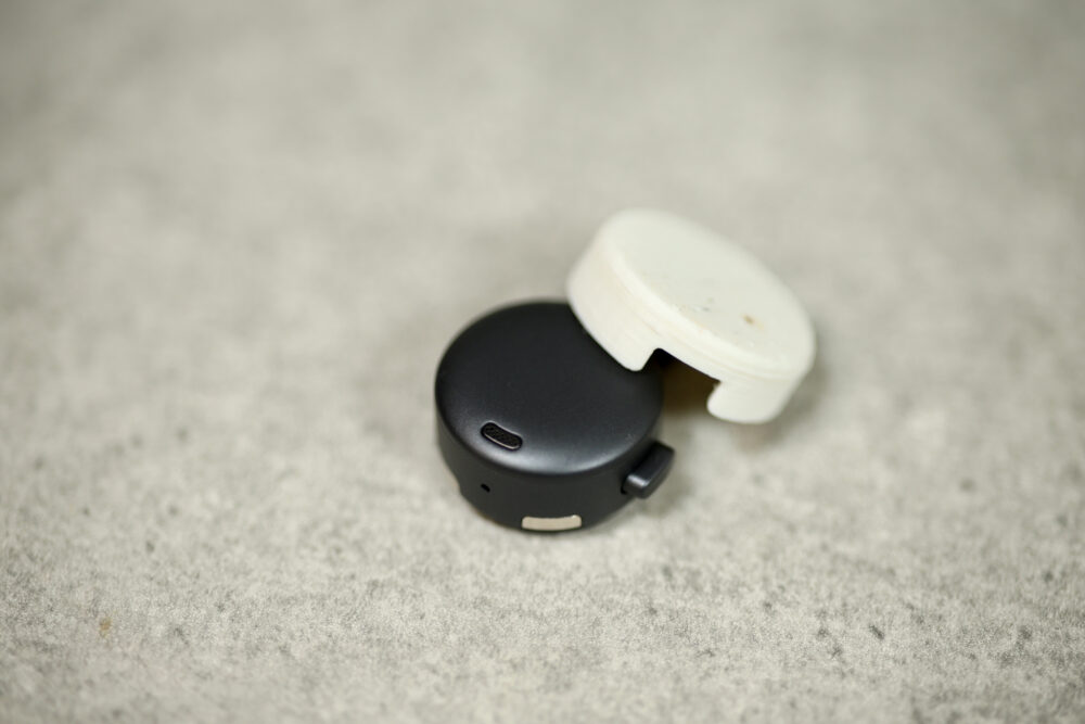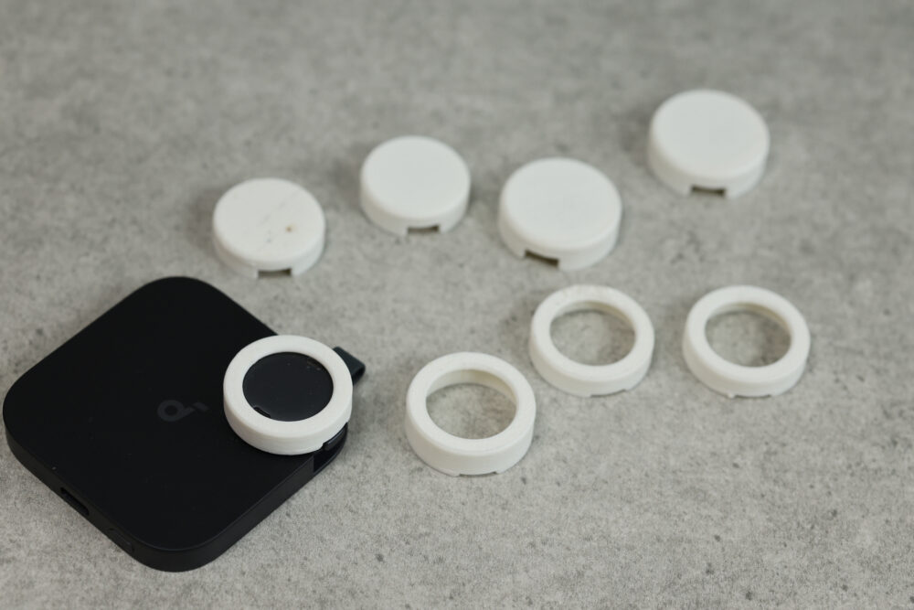 そこで、真ん中に穴を開けることにした。真ん中に穴を開けると、上から押すことでカバーを外せるようになった。さらに穴の大きさや全体の高さを調整し、本体にある複数のマイク穴を塞がないようにしてもらった。