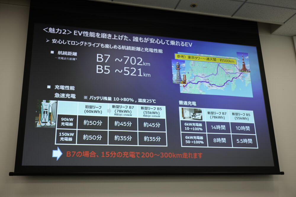 新型リーフのラインナップは、S、X、Gの3つのグレードで構成されている。昨年10月に先行発表されたのは78kWhの『B7』で、B7にはこの3グレードともが用意されていた。この2月にはよりリーズナブルなB5も登場。こちらには最上位グレードのGはラインナップされない。