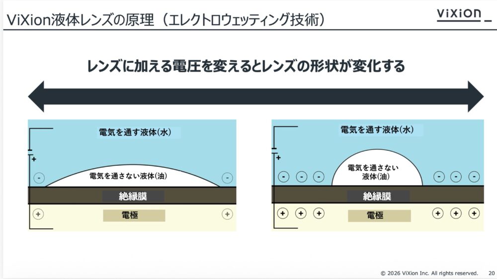 この製品の核心は、レンズの仕組みにある。ViXionは「エレクトロウェッティング」という技術を使った液体レンズを採用している。