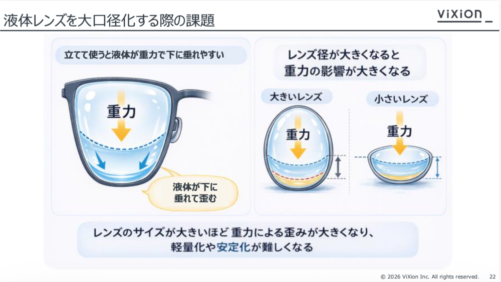 ただしこの仕組みは、レンズを大きくするのが難しい。液体レンズは直径が大きくなると、重力の影響で液体が垂れ下がり、安定した光学性能を保つのが難しくなるからだ。今回ViXion2では、内部の2種類の液体の密度と粘度を調整することでレンズ径9mmを実現したという。
