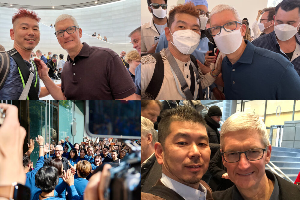 一番最初に身近に相見えたのは2018年にiPad(第6世代)の発表会(文教分野での機能性をアピールするために高校で行われた)でシカゴに行った時で、取材後の夜、市内のApple Michigan Avenueに行ったら、突如ティム・クック氏が現われ、一緒に写真を撮ってもらえた。その後も、2022年のWWDC(マスクをしている写真)、同じく2022年の秋のiPhone発表時に一緒に写真を撮って短い挨拶を交わす機会に恵まれた。
