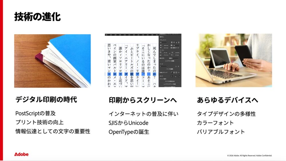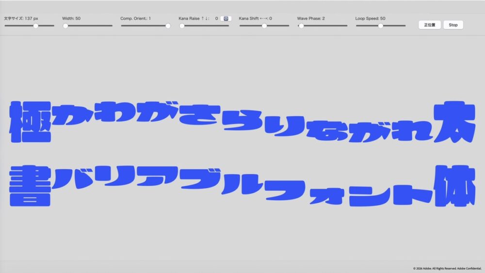 装丁家の方や、パッケージデザイナーの方は楽しみにお待ちいただきたい。また、アドビがこのような技術を発表、公開すると、他のフォントメーカーからも、この『仮名のみバリアブル』の仕組みを使ったフォントが公開されるかもしれない。それも含めて楽しみな発表だ。