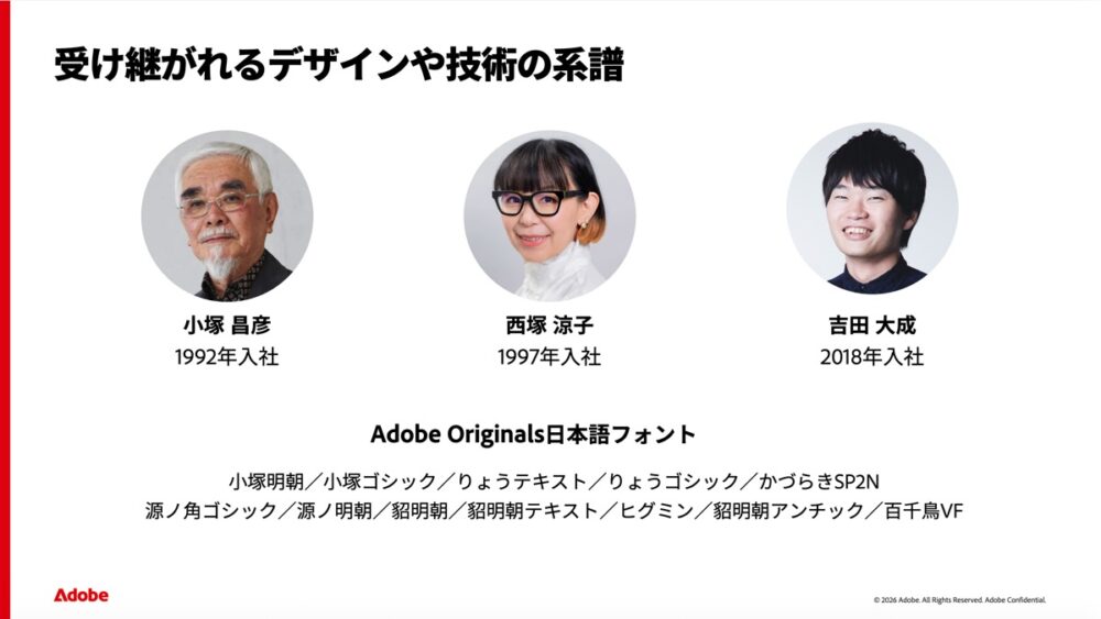 では、たくさんの方がフォントデザインに関わっているかというとそうではない。アドビの日本語版フォントに関わっている人は、デザイナー2人、エンジニア2人のわずか4人。歴代においてもそう多くはなく、ほんの数人の方が連綿と作業されているのだ。