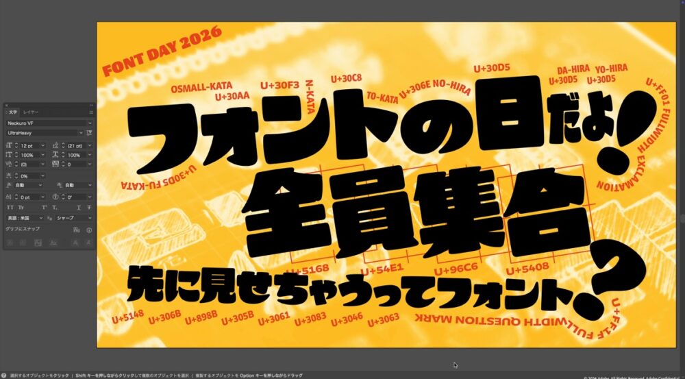 さて、フォントの日に発表された『ネオクロ』は、吉田さんがリードして作った最初のフォントである。ちなみに、アドビのフォントの日のプレゼンのタイトル画像は、毎年吉田さんがデザインしてたのだそうだ。